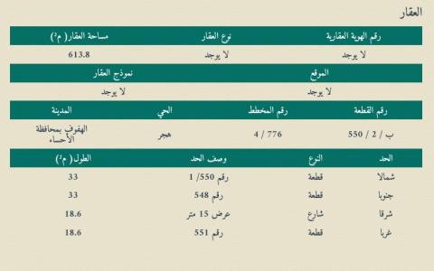 نصف أرض سكنية للبيع المنطقة: الشرقية المحافظة: الأحساء في شرق شرق الحديقة حرف ب رقم الأرض 550/2 المساحة 613 شارع 15 واجهة العقار: شرقاً حدود وأطوال العقار: 18.6*33 *لويكشن* https://maps.app.goo.gl/gqf3Bnn59ZTkdHfF8 الحد 644,490 ريال المشاهدات 73 تاريخ إنتهاء الإعلان 2025-08-29